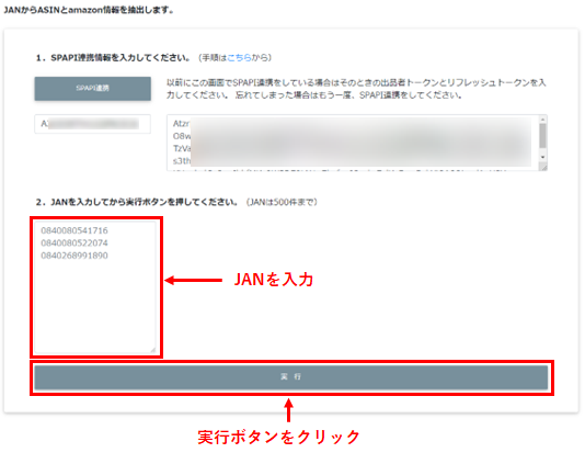 操作方法はamazon認証情報とJANを入力して「実行」ボタンをクリックします。