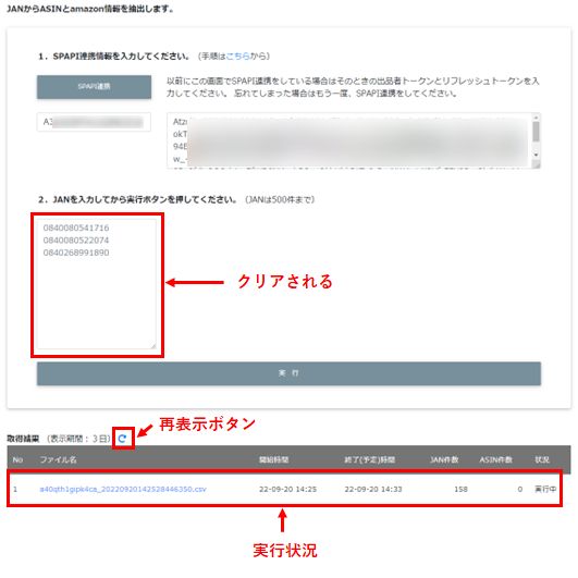 JANの入力欄がクリアされ、取得結果一覧に実行状況が表示されます。