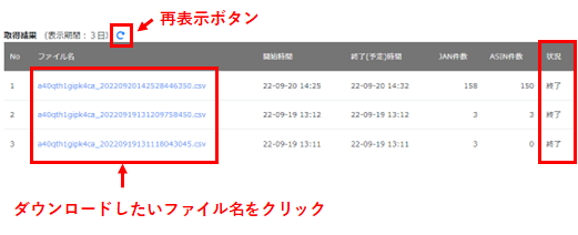 取得結果一覧のファイル名をクリックするとダウンロードできます。